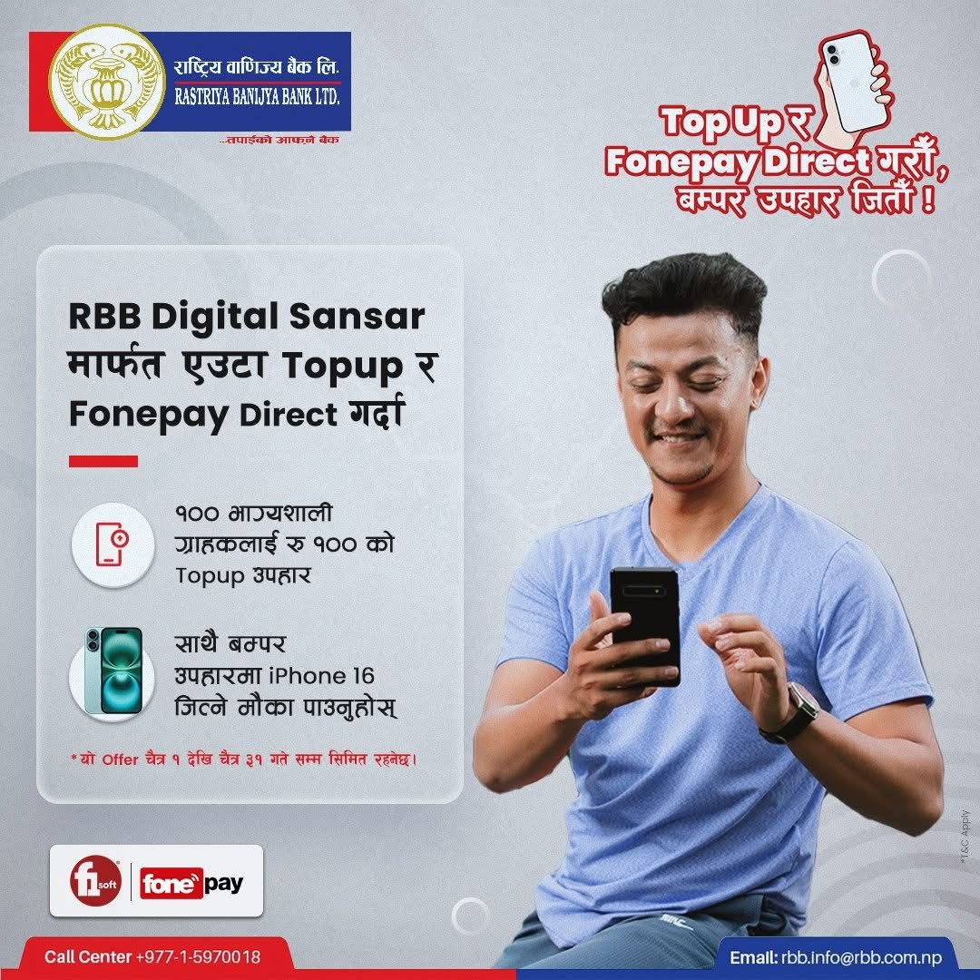 राष्ट्रिय वाणिज्य बैंकको अफर: ‘टपअप र फोनपे डाइरेक्ट’ गर्दा आइफोन १६ जित्ने अवसर