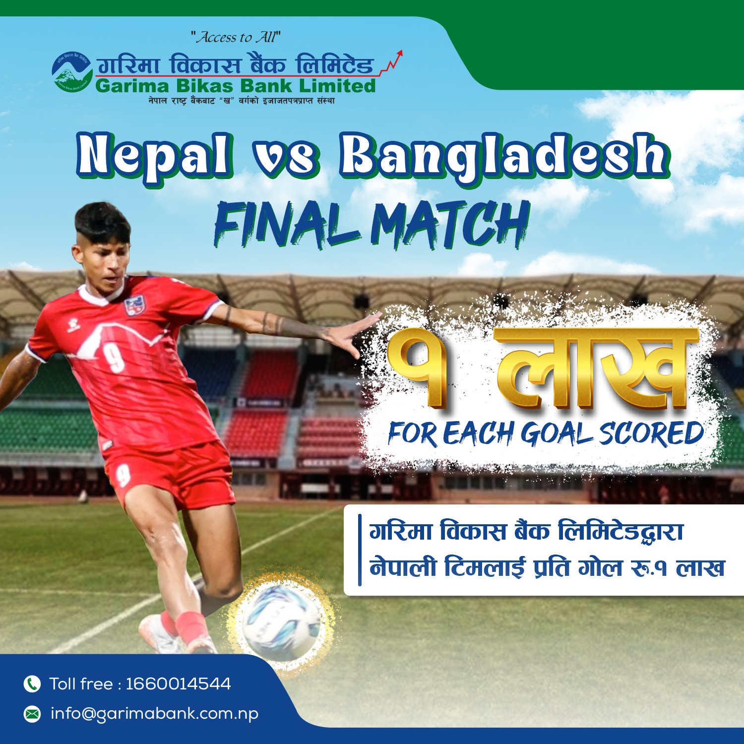 फाईनल खेलमा नेपाली टिमलाई गरिमा बैंकले प्रति गोल रु.१ लाख दिने