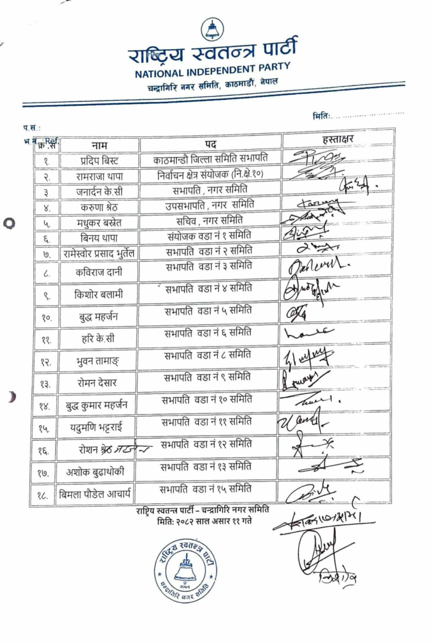 ज्ञापनपत्र बुझाउने प्रतिनिधिमण्डलमा रास्वपा काठमाडौं जिल्ला समिति सभापति प्रदिप बिष्ट, क्षेत्र नम्बर १० का संयोजक रामराजा थापा, नगर समिति सभापति जनार्दन केसी, तथा वडा सभापतिहरू सहभागी थिए।
