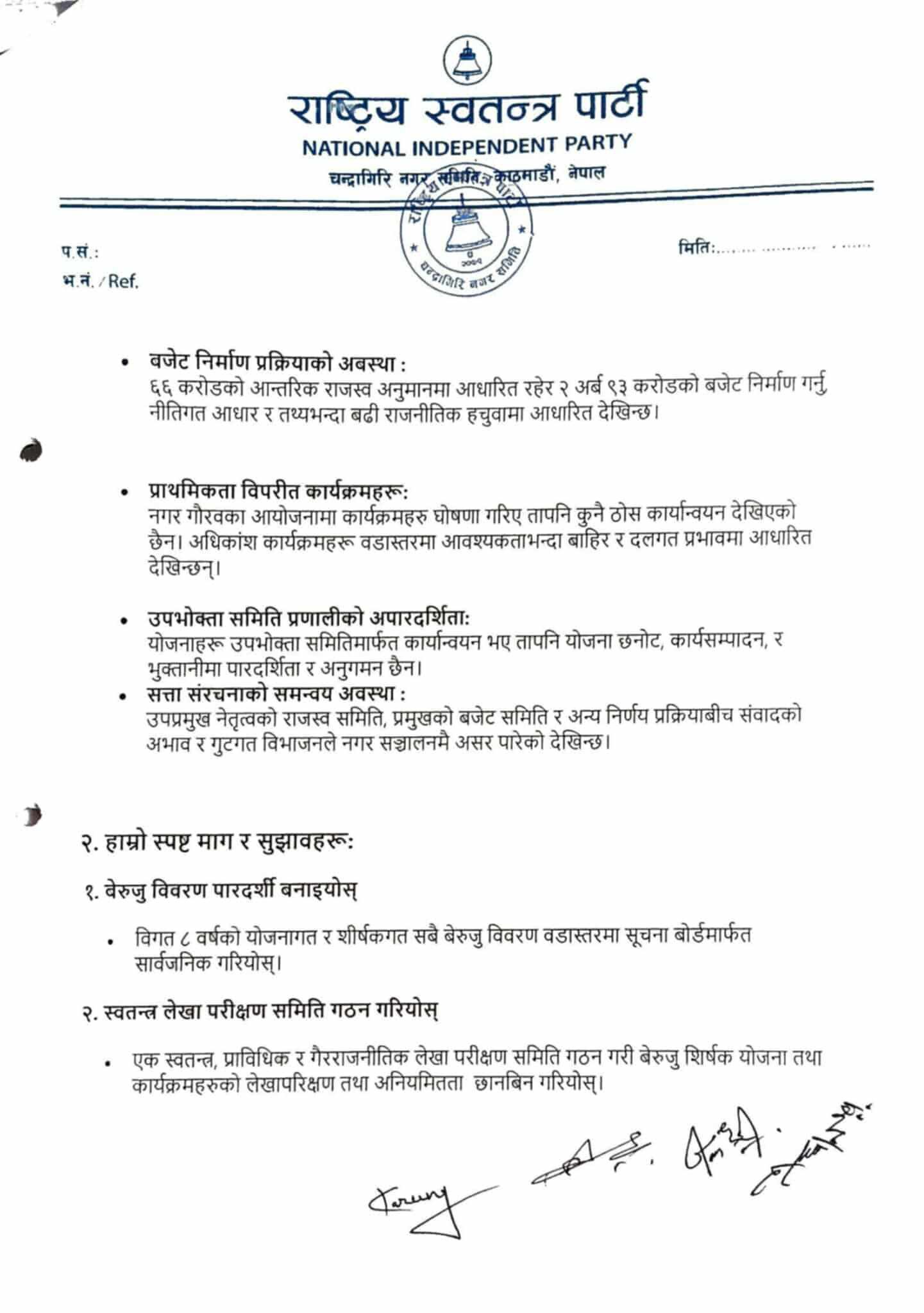 रास्वपाले ६६ करोड रुपैयाँको मात्र आन्तरिक आम्दानी अनुमान भएको अवस्थामा २ अर्ब ९३ करोडको बजेट ल्याइनु ‘नीति र यथार्थ विपरित’ भएको निष्कर्ष निकालेको छ। पार्टीले बजेटमा प्राथमिकता विपरित कार्यक्रमहरू समावेश गरिएको, उपभोक्ता समिति प्रणाली अपारदर्शी रहेको, नगर सञ्चालनमा संवादको अभाव देखिएको र गुटगत ध्रुवीकरणका कारण समग्र प्रणाली नै प्रभावित भएको उल्लेख गरेको छ।