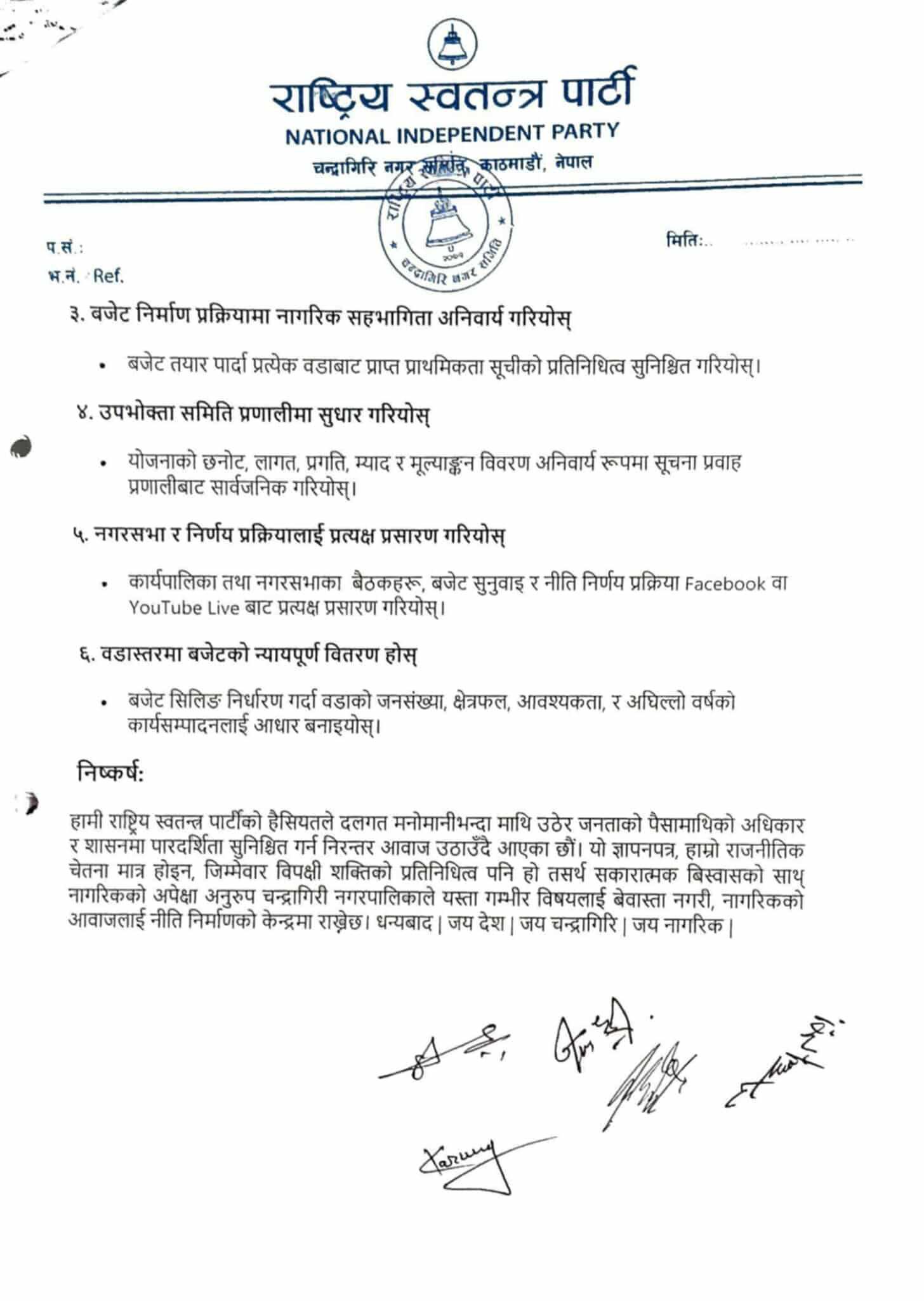 काठमाडौं-राष्ट्रिय स्वतन्त्र पार्टी (रास्वपा) चन्द्रागिरि नगर समितिले चन्द्रागिरि नगरपालिकाको आगामी आर्थिक वर्ष २०८२/८३ को बजेट राजनीतिक हचुवाको भरमा निर्माण गरिएको भन्दै कडा आलोचना गरेको छ। पार्टीले बजेटमा नीति, तथ्य र नागरिक सरोकारको समुचित प्रतिबिम्ब नदेखिएको दाबी गरेको हो।