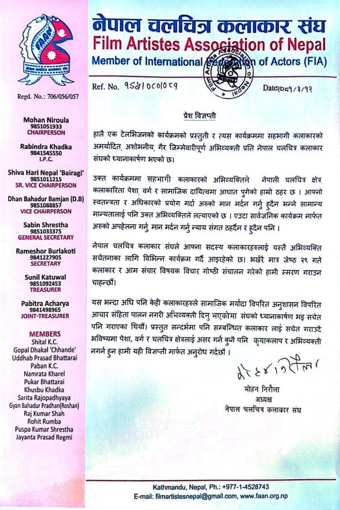 ‘उक्त कार्यक्रममा सहभागी कलाकारको अभिव्यक्तिले नेपाली चलचित्र क्षेत्र, कलाकारिता पेशा, वर्ग र सामाजिक दायित्वमा आघात पुगेको हाम्रो ठहर छ । आफ्नो स्वतन्त्रता र अधिकारको प्रयोग गर्दा अरुको मान मर्दन गर्नु हुँदैन भन्ने सामान्य मान्यतालाई पनि उक्त अभिव्यक्तिले लत्याएको छ । एउटा सार्वजनिक कार्यक्रममार्फत अरुको अपहेलना गर्नु, मान मर्दन गर्नु न्यायसगत ठहर्दैन र हुँदैन पनि, विज्ञप्तीमा भनिएको छ ।
