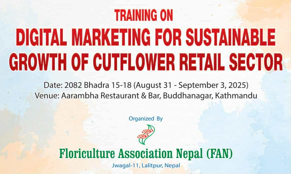 काठमाडौं।फ्लोरिकल्चर एशोसिएसन नेपाल ( फ्यान ) को आयोजनामा कटफ्लावर खुद्रा क्षेत्रको दिगो बढ्दो वृद्धिको लागि डिजिटल मार्केटिङ सम्बन्धि तालिम सम्पन्न भएको छ । राजधानी काठमाडौंको बुद्दनगरस्थित आरम्भ रेष्टुरेन्टमा भदौ १५ गतेदेखि शुरु भएको उक्त तालिम भदौ १८ गते सम्पन्न भएको हो ।