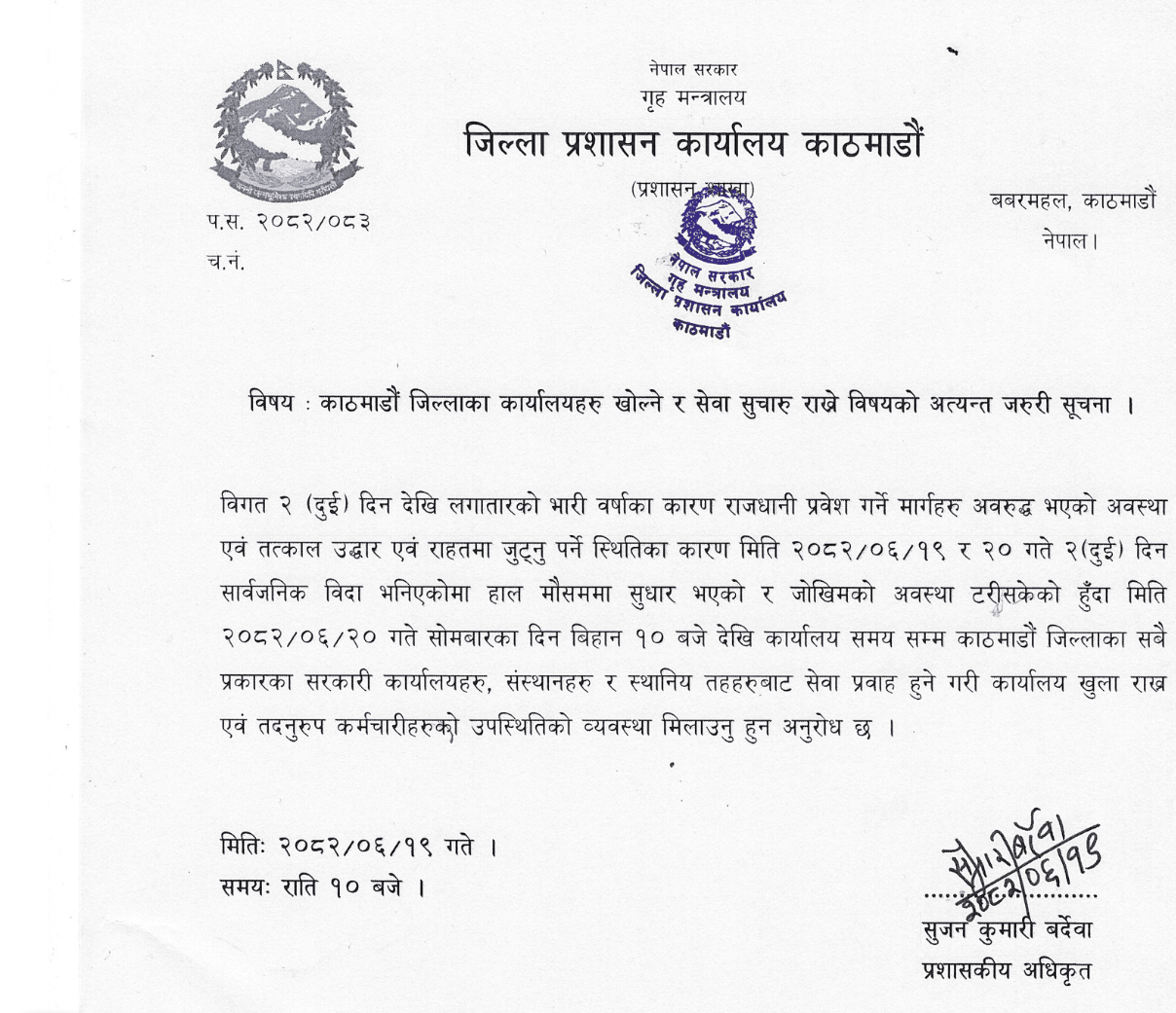 “मौसममा सुधार भएको र जोखिमको अवस्था टरीसकेको हुँदा असोज २० गते सोमबार बिहान १० बजेबाट काठमाडौं जिल्लाका सबै प्रकारका सरकारी कार्यालय, संस्थान र स्थानीय तहहरूबाट सेवा प्रवाह हुने गरी कार्यालय खुला राख्न अनुरोध गरिन्छ।”