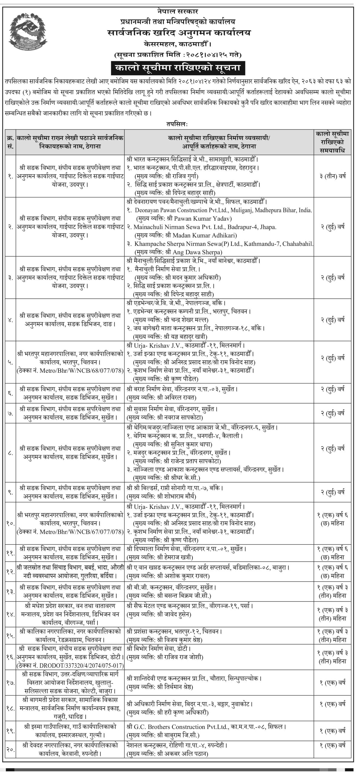 शुक्रबार सूचना प्रकाशित गर्दै कालोसूचीमा राखिएका निर्माण कम्पनी तथा व्यवसायीले कालोसूचीमा राखिएको अवधिभर कुनै पनि खरिद काराबाहीमा सहभागी हुन पाउने छैनन्। कार्यालयका अनुसार १ देखि ३ वर्षसम्मका लागि कालोसूची राखिएको छ।