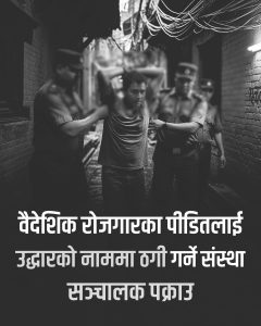 काठमाडौं।वैदेशिक रोजगारीका नाममा पीडित भएका व्यक्तिहरूबाट रकम असुल्ने आरोपमा एक संस्थाका सञ्चालक पक्राउ परेका छन्। जिल्ला प्रहरी परिसर काठमाडौंले ‘वैदेशिक रोजगार उद्धार नेपाल काठमाडौं’ नामक संस्थाका सञ्चालक ६६ वर्षीय इन्द्रलाल गोलेलाई नियन्त्रणमा लिएको हो।