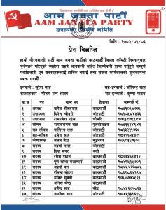काठमाडौं।आम जनता पार्टी (आजपा)को काठमाण्डौ जिल्ला कमिटी पुनर्गठन गरिएकोछ ।