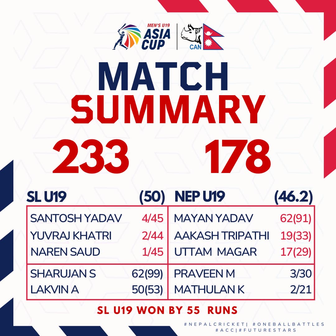 नेपालका लागि मयन यादवले सर्वाधिक ६२ रन बनाए भने आकाश त्रिपाठीले १९ र उत्तम मगरले १७ रन मात्र बनाउन सके । त्यसअघि सुरुवाती ब्याटिङ गरेको श्रीलङ्काले निर्धारित ओभरमा ९ विकेट गुमाउँदै २ सय ३३ रन बनाएको थियो ।